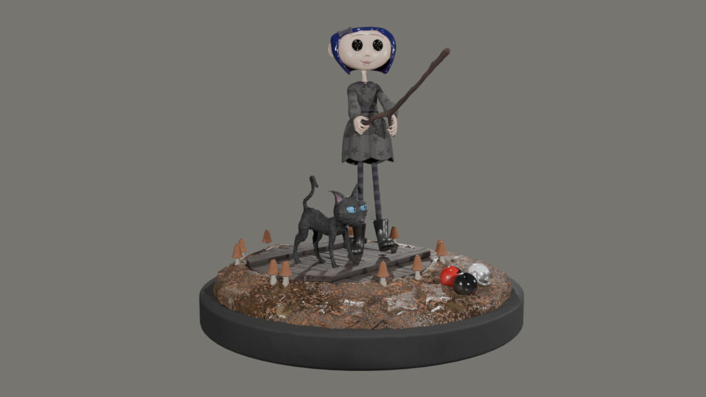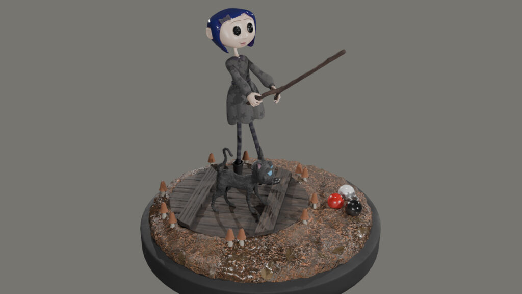 Ambientación 3D inspirada en el universo visual de Coraline, recreando una escena oscura y fantástica que remite al tono inquietante de la película. El proyecto se centró en modelar un personaje estilizado junto a elementos del entorno que refuerzan la atmósfera misteriosa del mundo alternativo. Se trabajaron materiales envejecidos, iluminación contrastada y detalles orgánicos en el terreno para generar profundidad y carácter. La composición busca transmitir una sensación de extrañeza y curiosidad, combinando inocencia y oscuridad, características propias del imaginario visual de la obra.